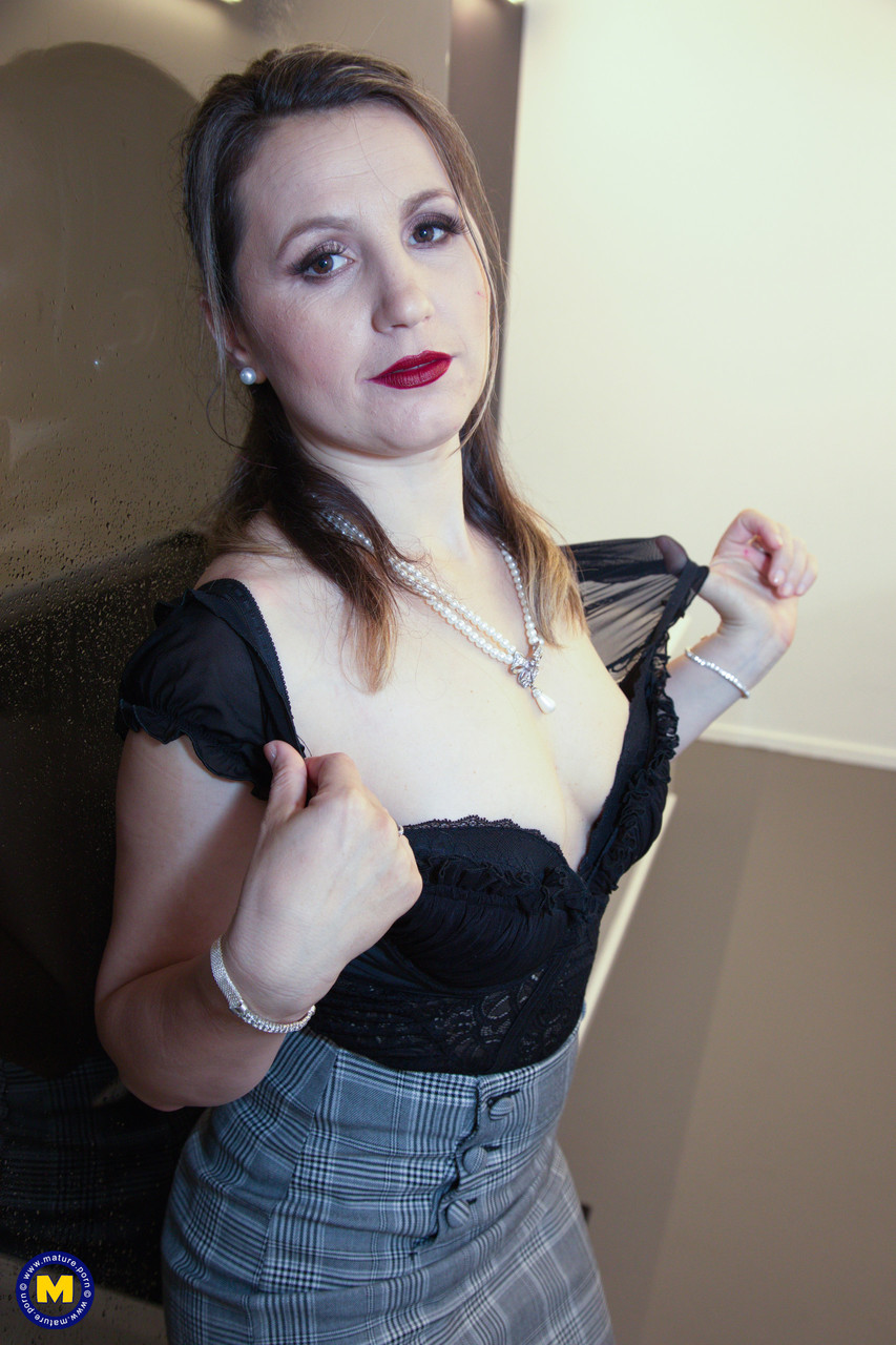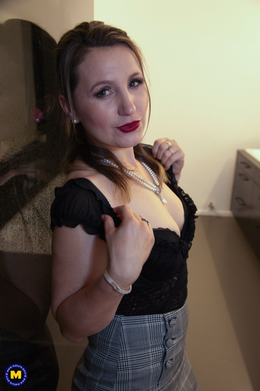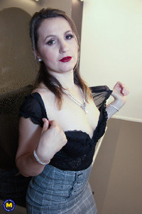 Милфа в чулках Ольга Лав обнажает свою объёмную грудь и круглую попку перед большим зеркалом (14 фото)