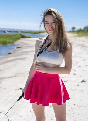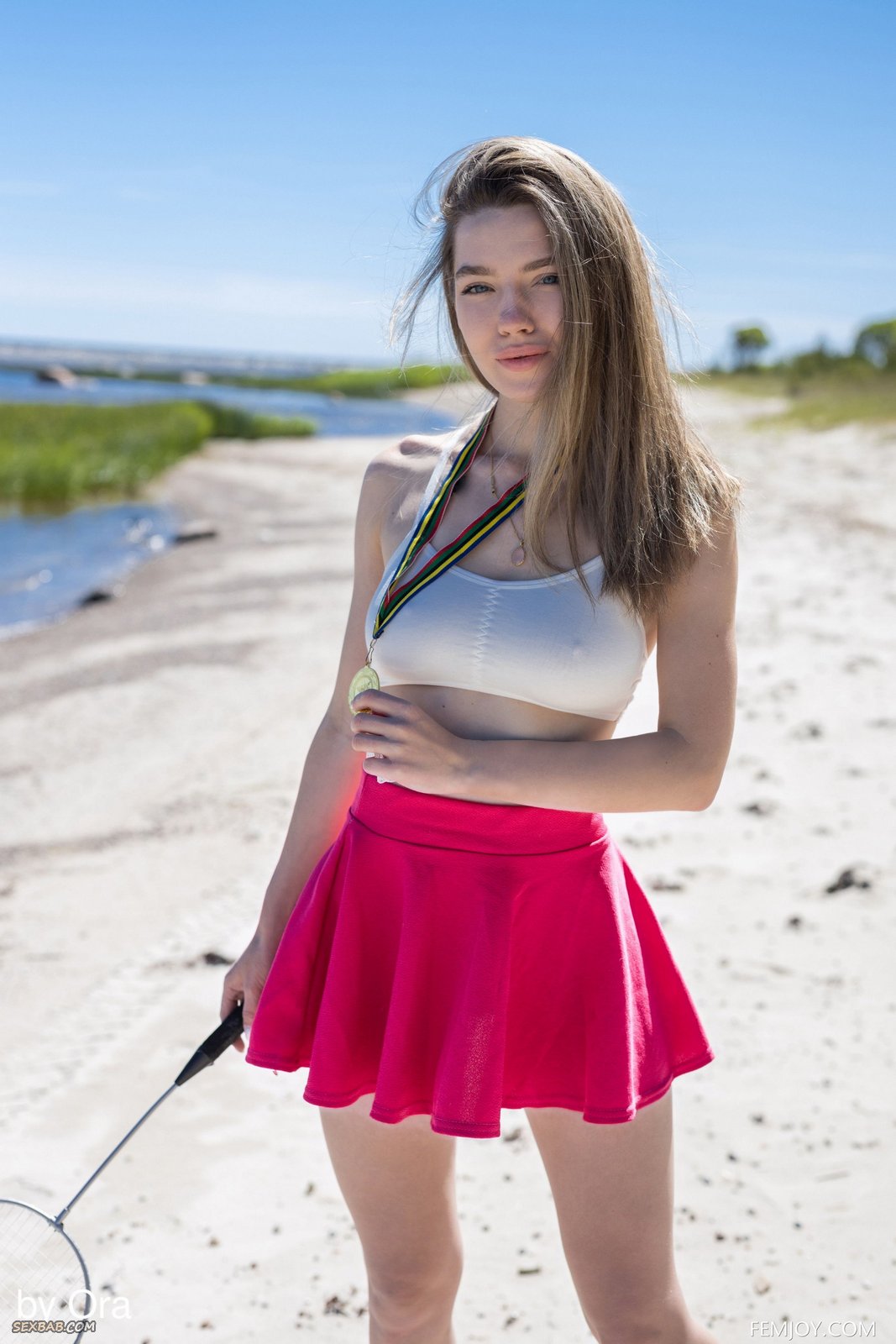 Описание: Энергично размахивая ракеткой на пляже, молодая спортсменка в короткой юбке без трусов медленно разделась до гола на горячем песке и развратно раздвинула стройные ноги, выставляя на показ крупным планом свою бритую сочную письку с большими половыми губками.