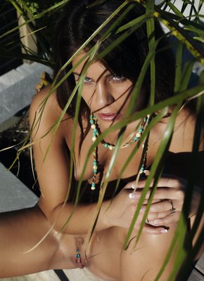 Голая загорелая брюнетка с интимной стрижкой