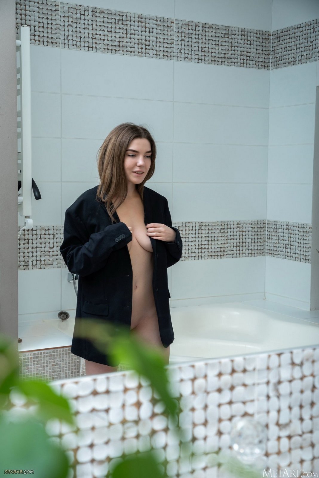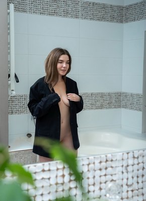 Грудастая девка позирует в ванной комнате
