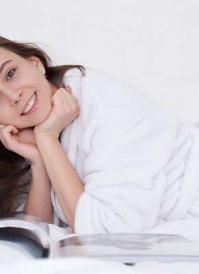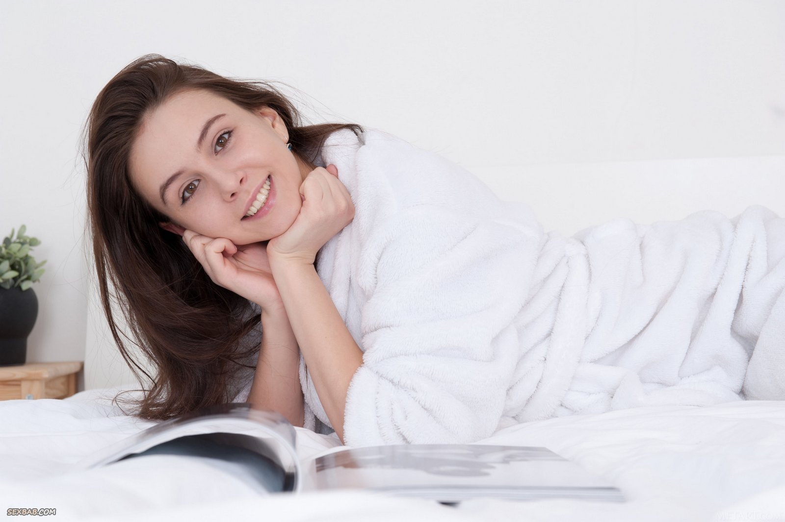 Молодая брюнетка сняла халат в постели
