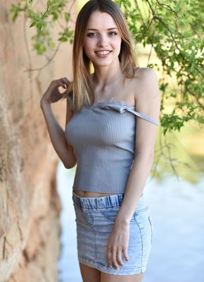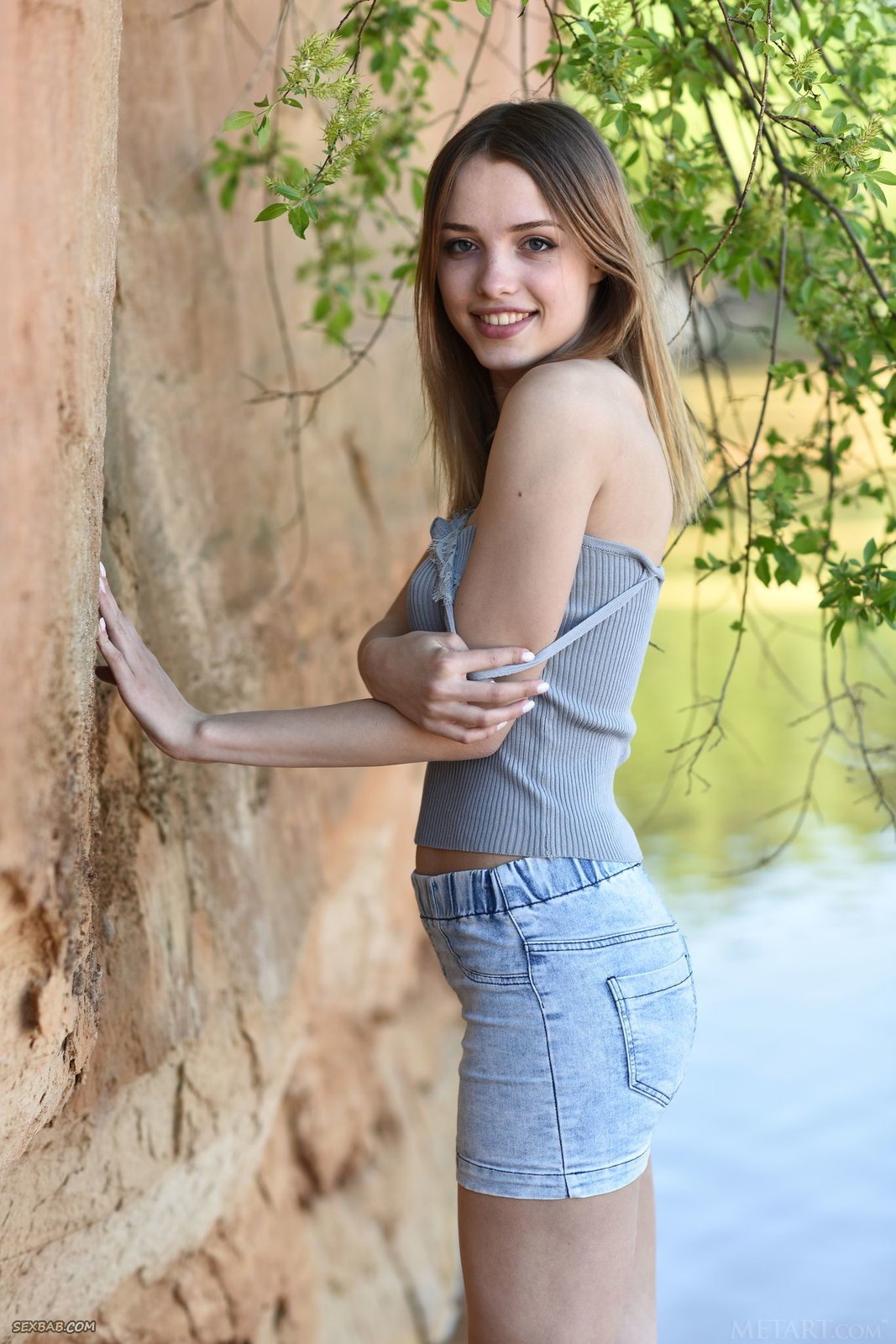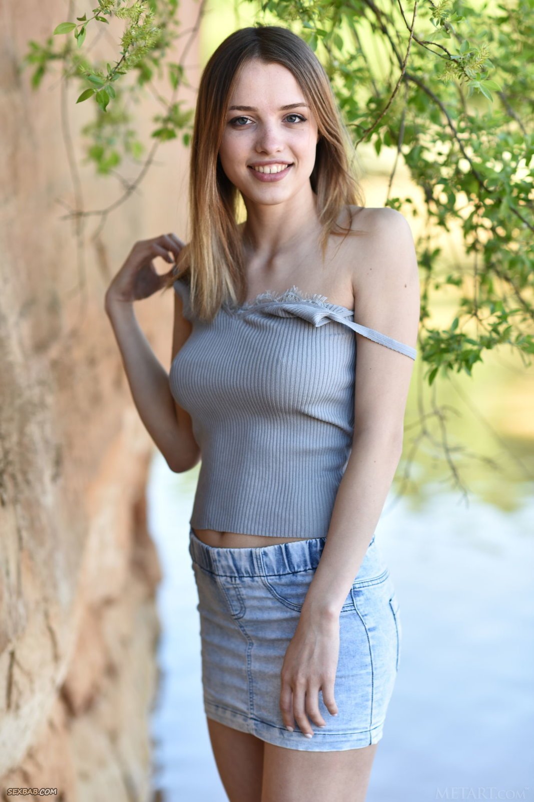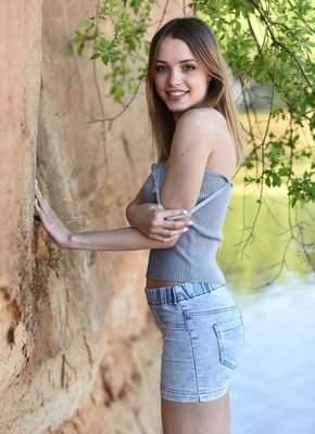 Описание: Выбрав наиболее подходящее местечко рядом с речкой на природе, худая девица с милой широкой улыбкой начала эротично позировать в джинсовой юбке и майке, в будущем все же медленно оголяясь. В обнаженном виде стройная крошка с натуральными буферами располагается на песке и прогибаясь раком выставляет попочку с бритой щелкой.