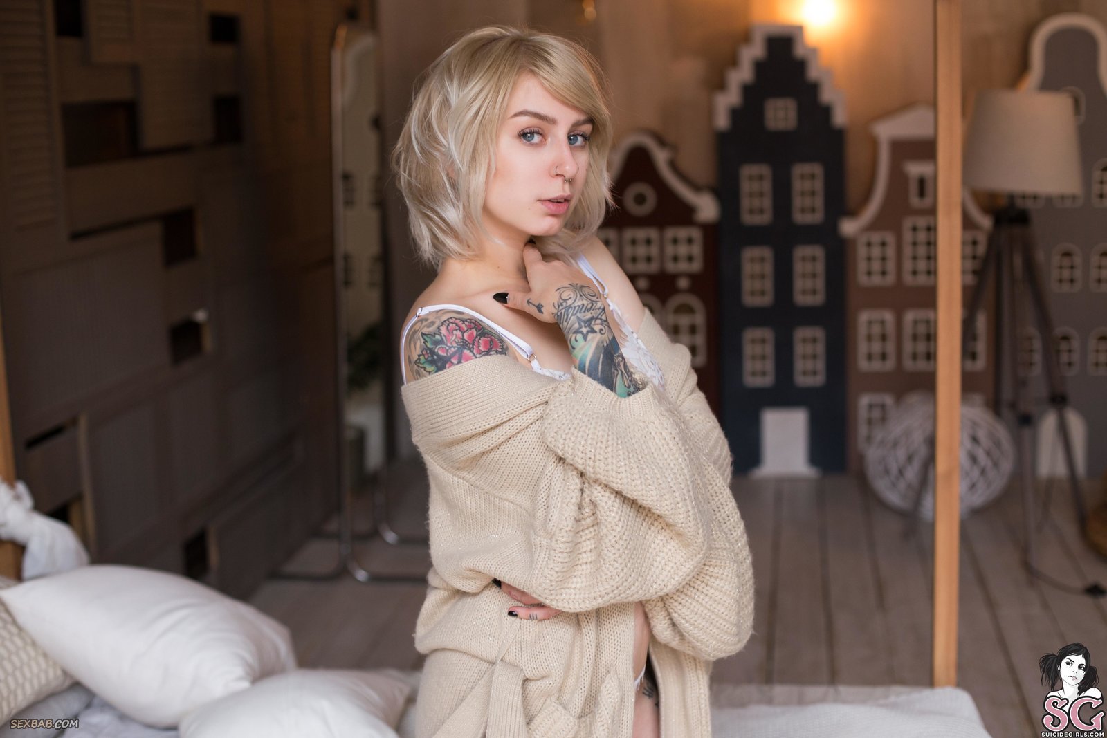 Описание: Скинув кофту, очаровательная девка с татуировками и пирсингом в носу, забравшись на кровать, показывает себя перед фотокамерой в нижнем белье белого цвета. Наслаждаясь съёмкой, сексуальная стройняшка нежно поглаживает себя руками и в будущем все же оголяется, немного делая акцент на маленьких возбужденных сиськах и попке.