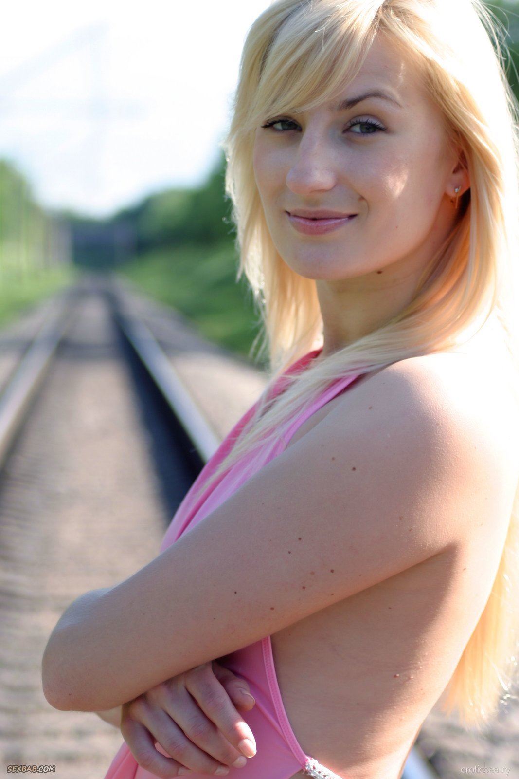 Описание: Прогуливаясь по рельсам, очаровательная блондинка в короткой юбке и туфлях на высоком каблуке старается эротично позировать и мило улыбаться. В дальнейшем же, когда сексуальная девушка разделась до гола, можно было во всей красе рассмотреть её плоские сиськи и бритую письку.