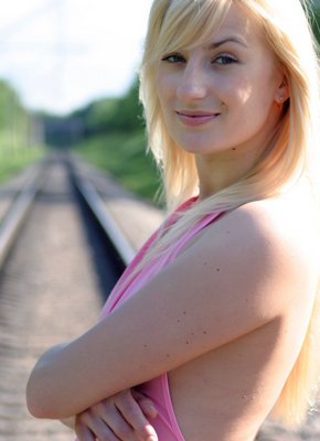 Голая блондинка сидит на рельсах