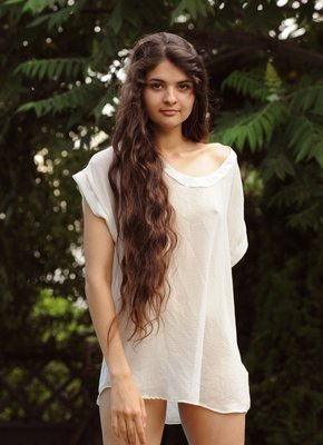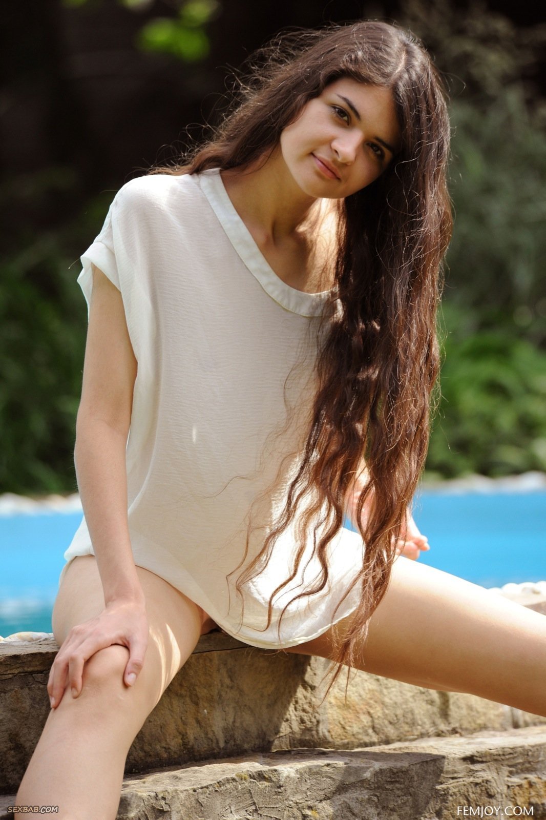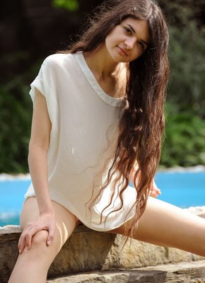 Описание: Накинув на голое тело белую футболку, длинноволосая милашка с маленькой грудью и голой писей купается в бассейне, между делом позируя перед фотографом с камерой. Нежась в воде, сексуальная девушка с большой радостью и возбуждением показывает нам бритую письку с интимной стрижкой на волосатом лобке, а так же красивую попку.