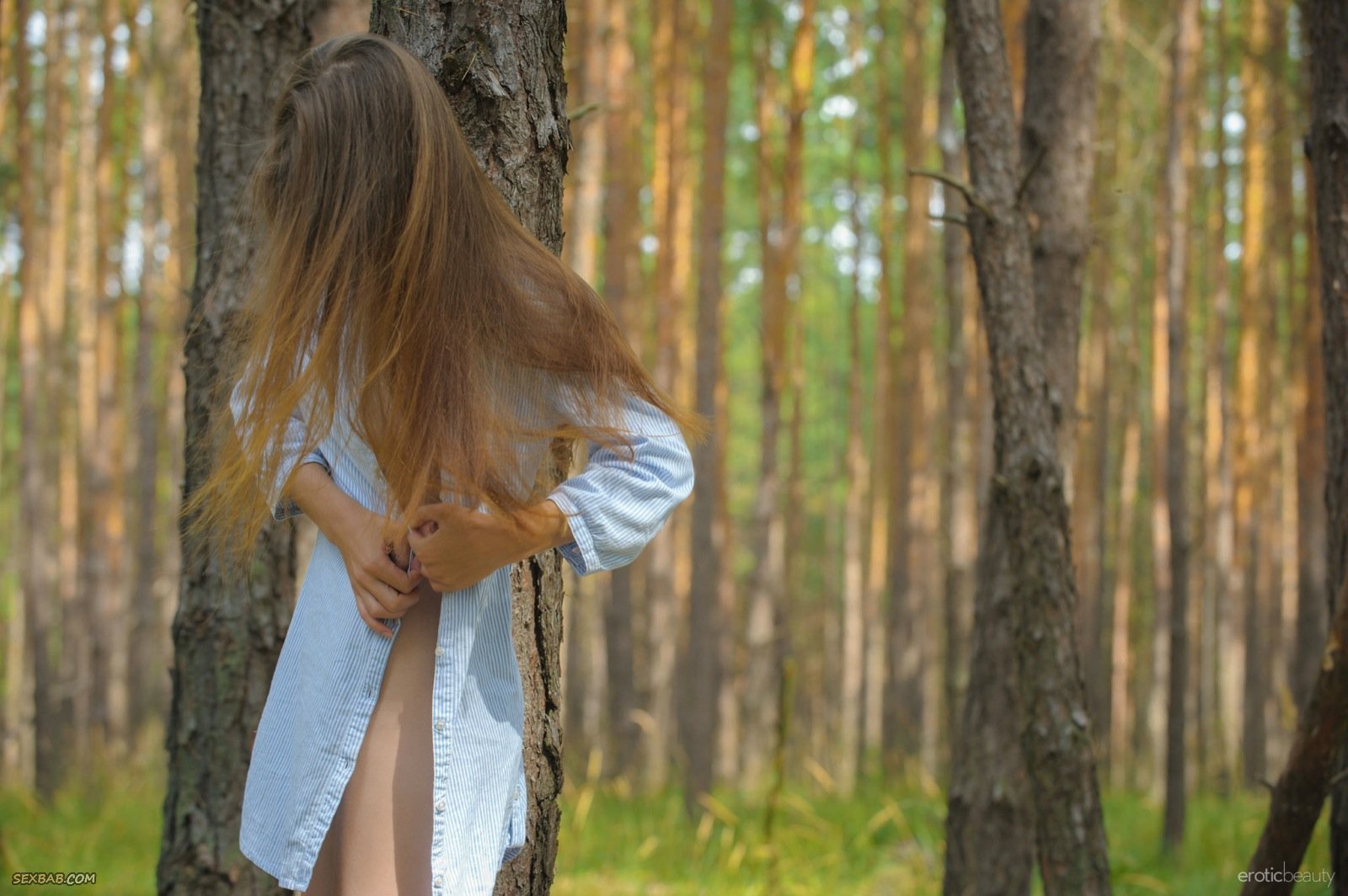 Описание: Мило улыбаясь, привлекательная девица в длинной рубашке на голое тело эротично позирует гуляя в лесу, в будущем все же раздевается догола. Ощущая в процессе удовольствие, молодая стройняшка с упругими натуральными сиськами порой присаживается на бревно и раздвигая промежность засвечивает бритую письку с прической на лобке.