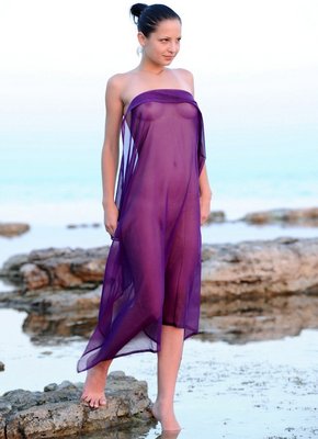 Описание: Скинув короткие шортики, обнажённая молодая девица резвится на море перед фотокамерой и с улыбкой на лице показывает себя со всех сторон, порой прикрываясь парео. Таким образом стройная брюнетка продемонстрировала красивые сиськи с бритой писькой, а намочившись повернулась мокрой попкой к фотографу.