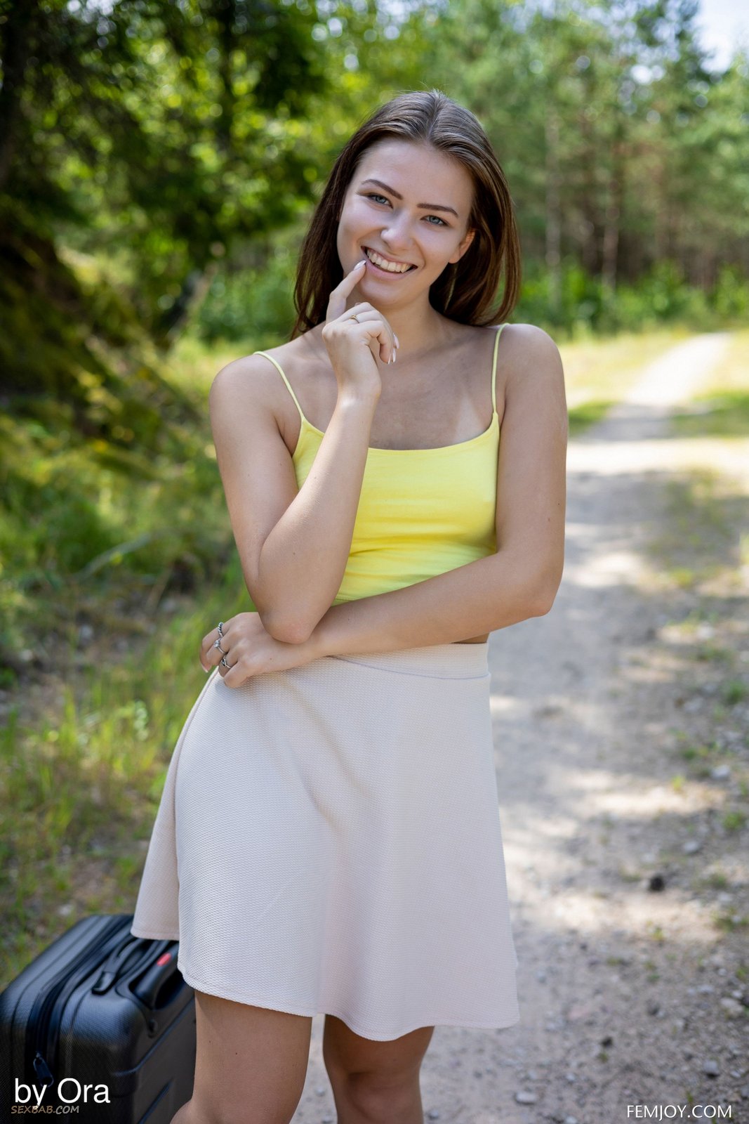 Описание: Решив немного разнообразить свой отдых, молодая путешественница кокетливо стянула с себя короткую юбку с маечкой и во всей красе показала бритую пиздёнку на проселочной дороге. Страстно извиваясь всем телом, деваха с натуральными прелестями перепробовала множество развратных поз и успешно показала на камеру свои самые интимные места.